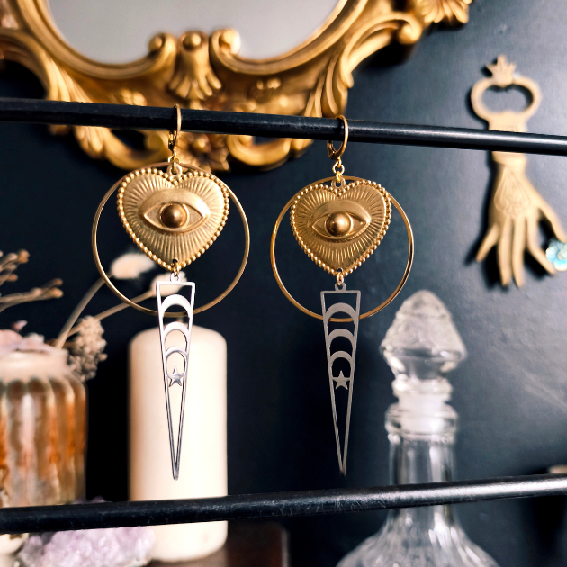 Puissantes et envoûtantes, elles incarnent la protection et l’énergie spirituelle. Le cœur sacré doré, orné d’un œil central, symbolise l’intuition et la clairvoyance.
