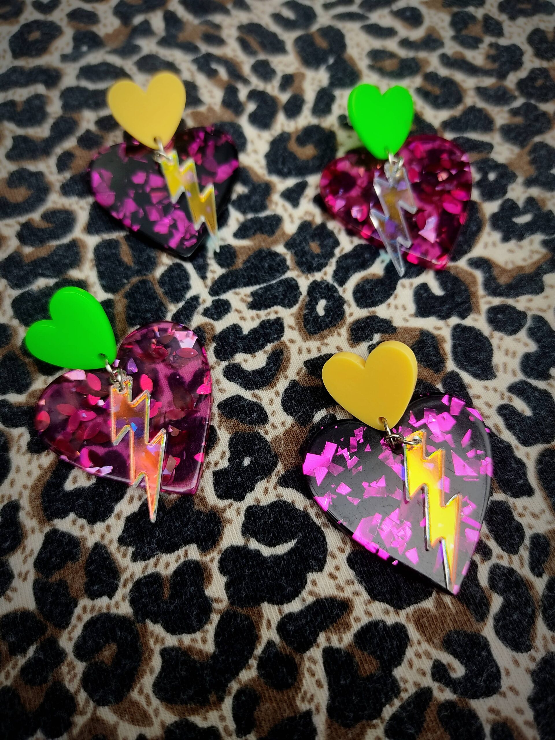 Modèle : coeur glitter rose paillettes, puce d’oreilles jaune et éclair holographique