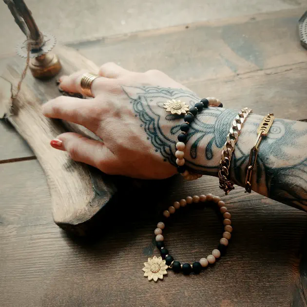 Il est composé de perle beige et noir mat et d’une breloque marguerite en laiton