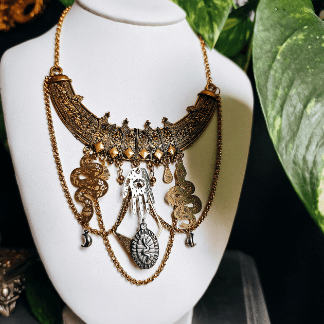 Plongez au cœur de la mythologie avec ce collier plastron inspiré de la légendaire Médusa. Véritable pièce de caractère, ce bijou met en scène des serpents qui s’entrelacent, puissant et envoûtant.